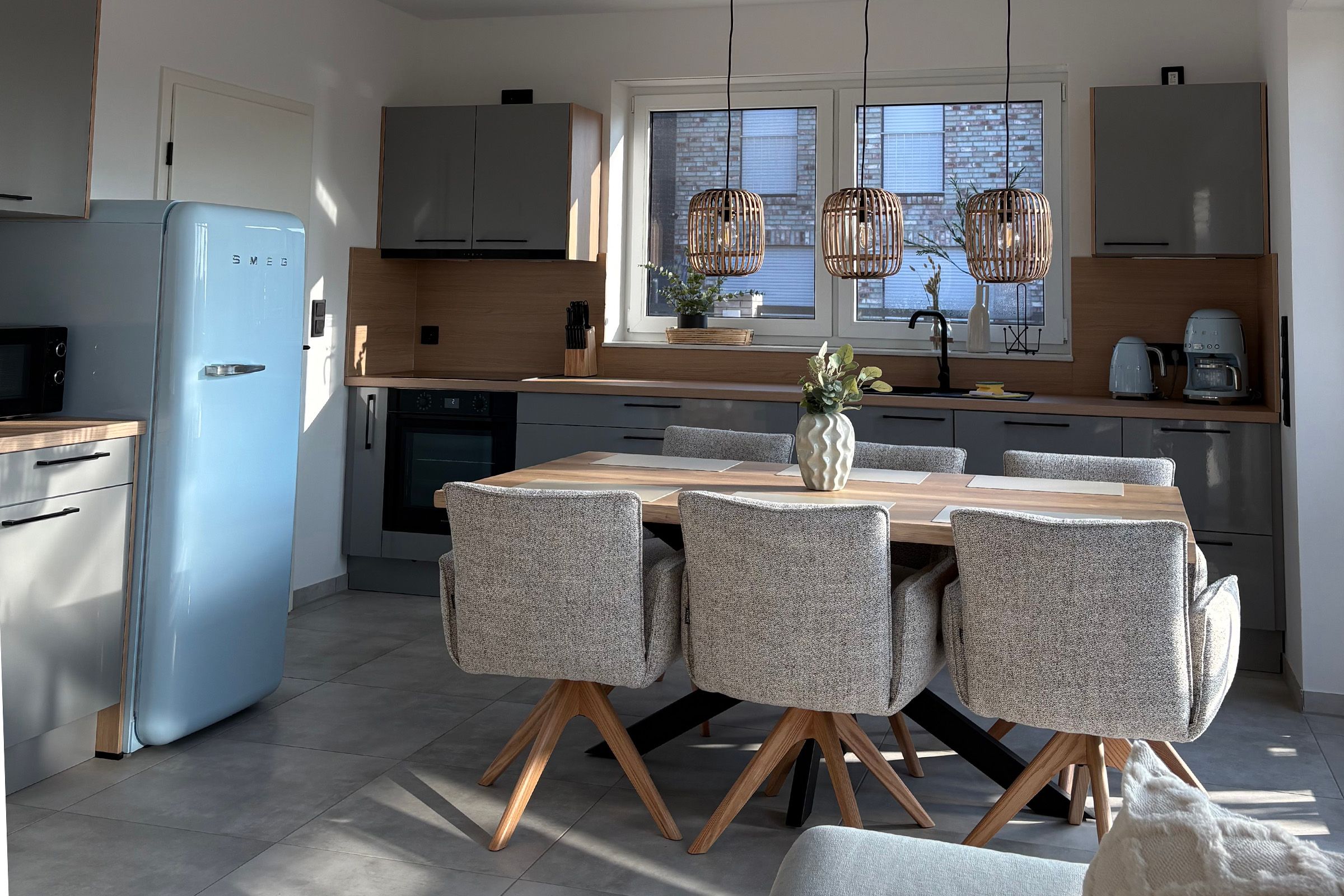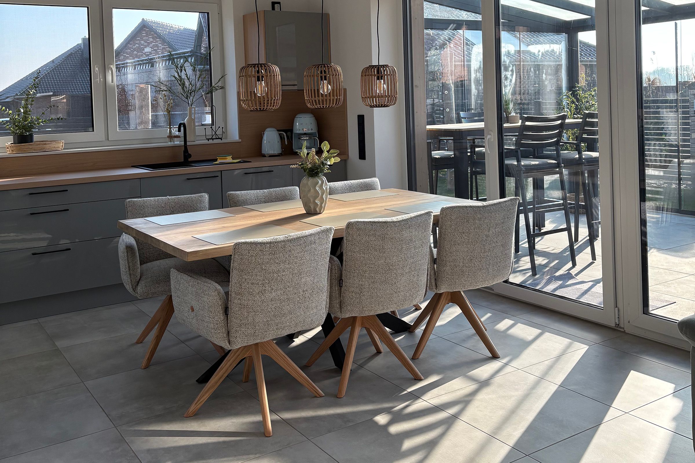 Im Wohnbereich erwartet Sie ein gefliester Boden, eine gemütliche Sofaecke mit Sofa, Sesseln und TV (Satellitenanschluss) sowie WLAN und Radio. Der Essbereich mit Esstisch ist offen in den Wohnraum integriert und wird durch eine zum Wohnzimmer offene Küche ergänzt. Diese ist umfassend ausgestattet mit Ceran-Herd, Backofen, Mikrowelle, Kühlschrank, extra Gefrierschrank, Spülmaschine, Kaffeemaschine, Wasserkocher, Toaster, Mixer sowie Küchenutensilien, Geschirr und Besteck. Eine Erstausstattung ist vorhanden, ebenso Bettwäsche, Handtücher, Badetücher und Geschirrhandtücher.