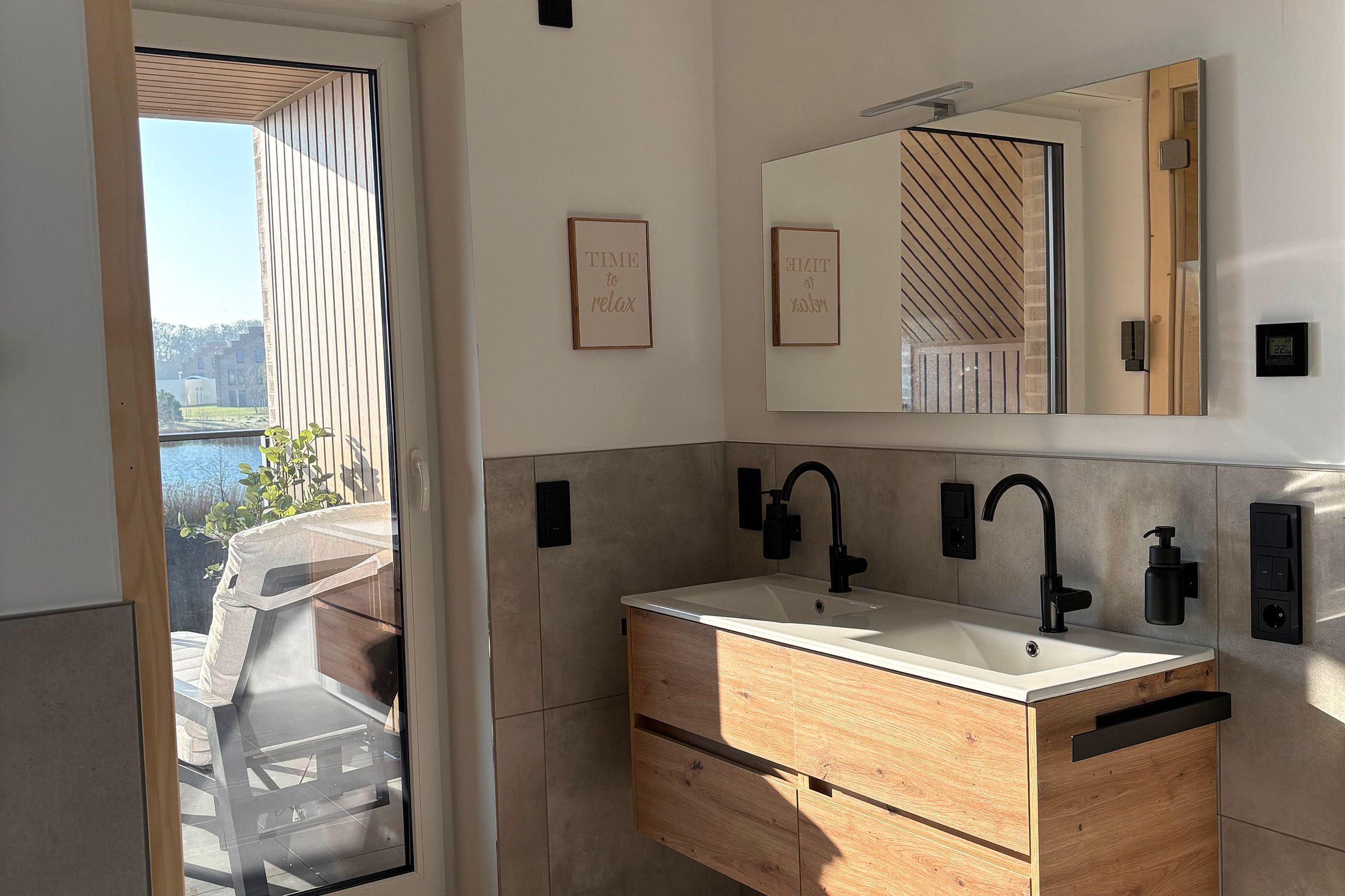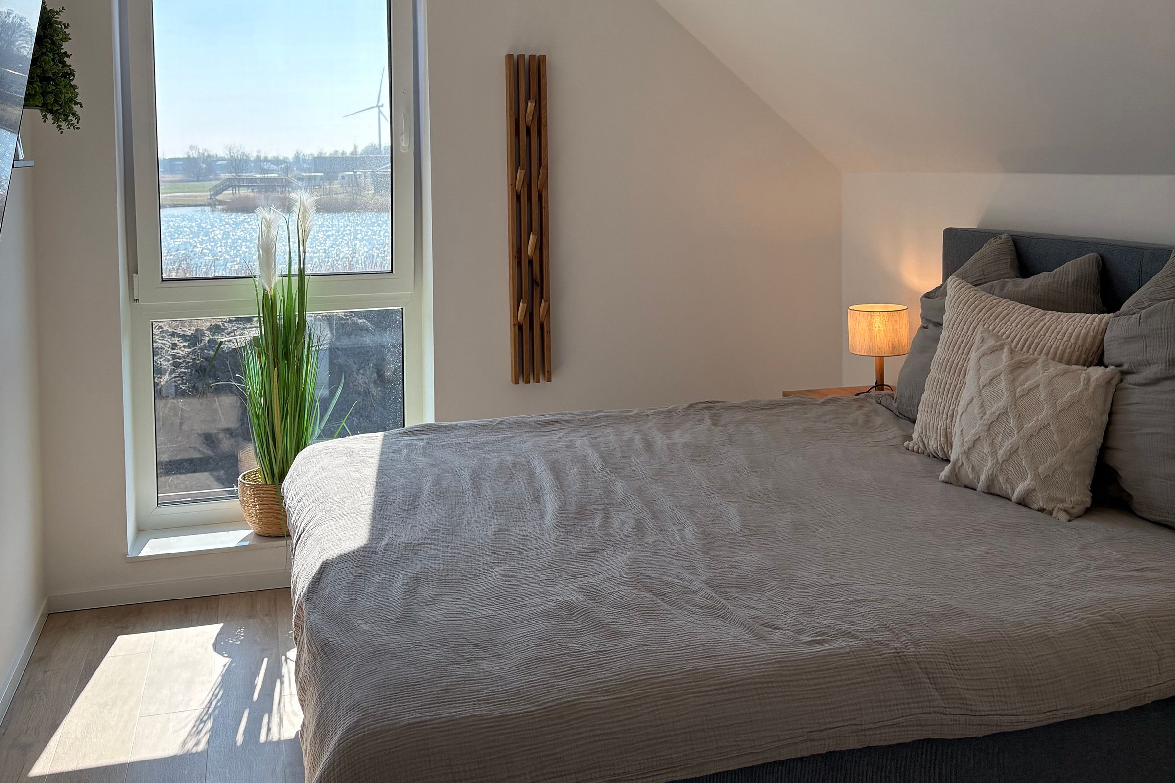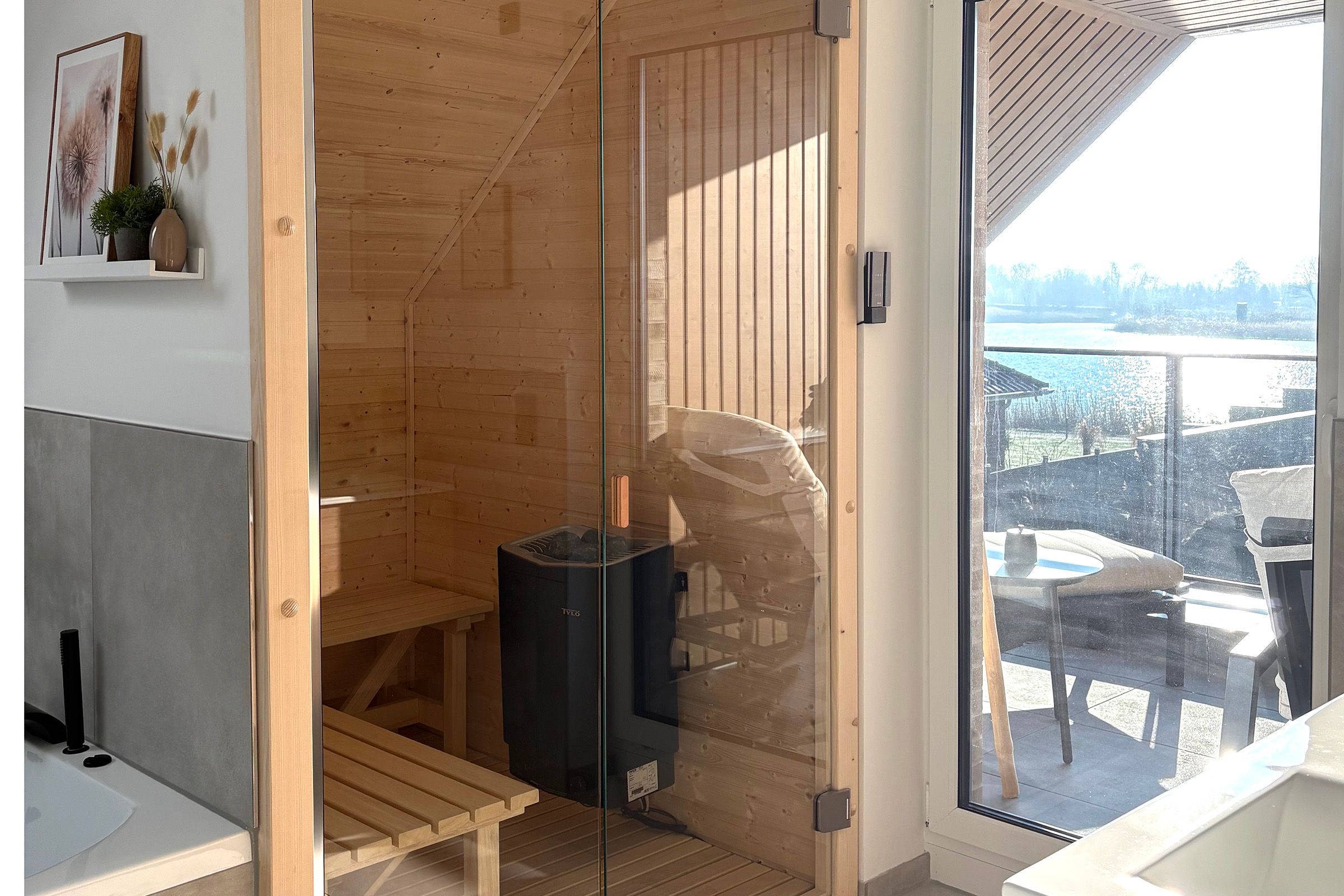 Zwei Badezimmer stehen bereit, darunter bodengleiche Duschen (insgesamt 2) sowie eine Badewanne. Haartrockner, Spiegel, Waschbecken und WC sind vorhanden. Für längere Aufenthalte nutzen Sie Waschmaschine und Trockner jeweils zur Eigennutzung sowie einen Wäscheständer und Staubsauger. Beheizt wird das Haus über eine Wärmepumpe mit Fußbodenheizung; Rauchmelder und Feuermelder sind vorhanden. Ein besonderes Highlight ist der Wellnessbereich mit Sauna und Badewanne mit einer Whirlpool-Funktion zur Eigennutzung. Ein Wintergarten ergänzt das Raumangebot und unterstreicht den hochwertigen Charakter der Unterkunft. Genießen Sie außerdem den Landschafts-, See- und Gartenblick.