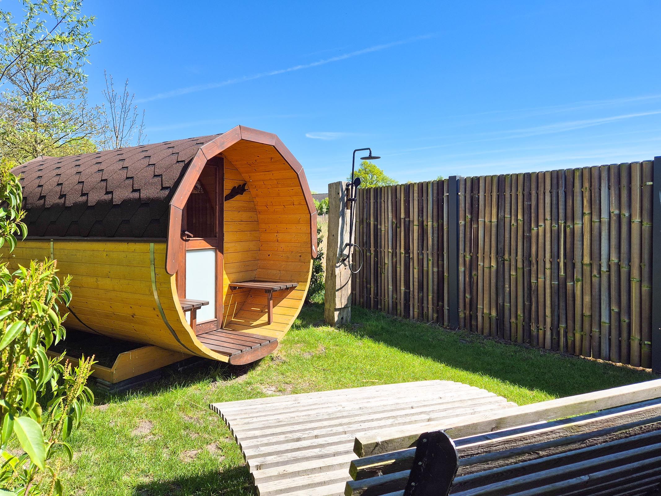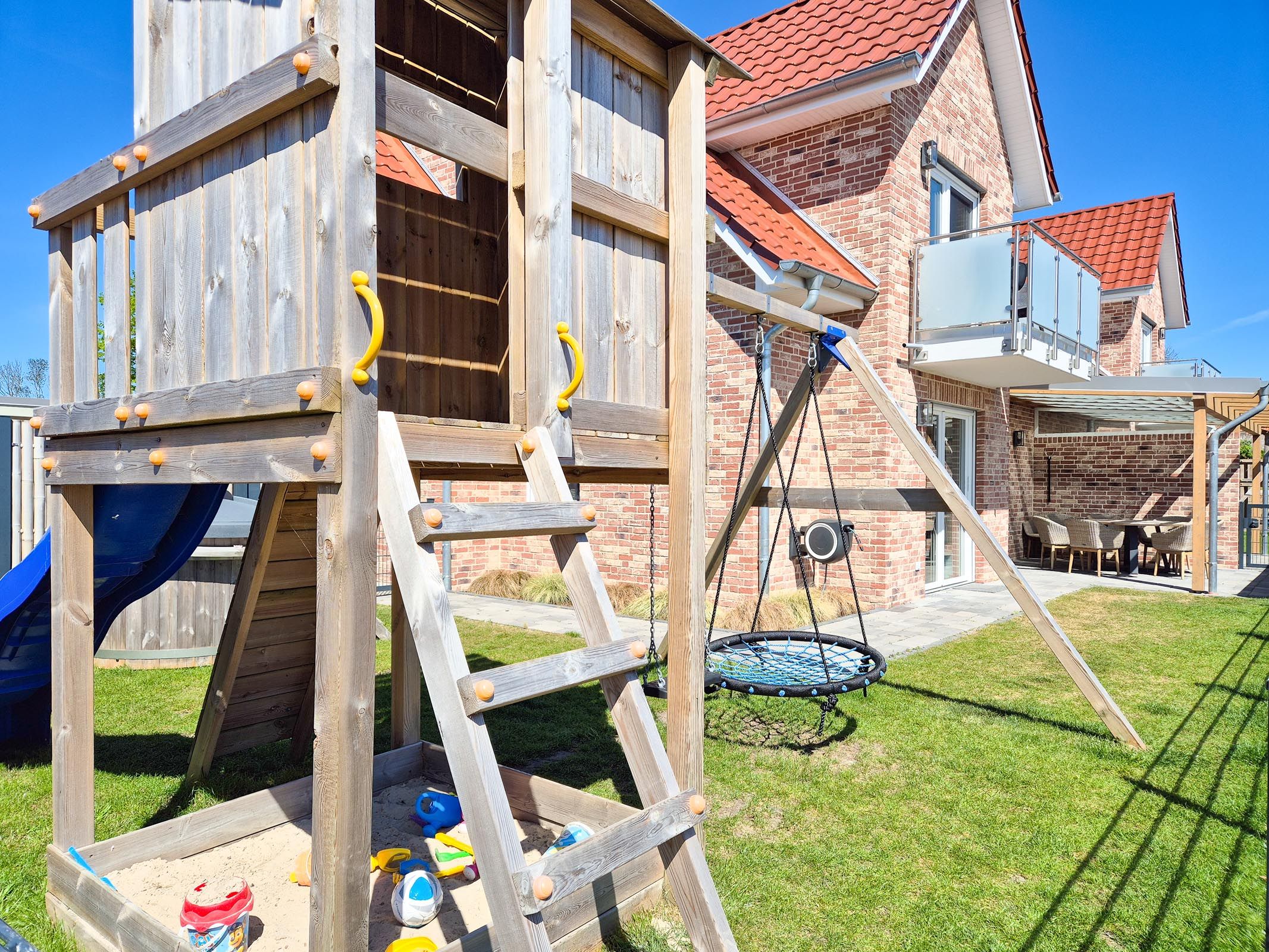 Es gibt einen eigenen großzügigen Garten, der komplett eingezäunt ist. Ebenso finden Kinder tolle Überraschungen, wie den großen Spielturm mit Sandkasten. Außerdem gibt es einen beheizbaren Holzpool, welcher auch bei kälteren Jahreszeiten genutzt (Nutzung gegen eine kleine Gebühr) werden kann. Im Garten vor dem Haus, befindet sich ein Wellnessbereich mit einer tollen finnischen Gartensauna (Nutzung gegen eine kleine Gebühr) mit Regendusche und Entspannungsmöglichkeiten.