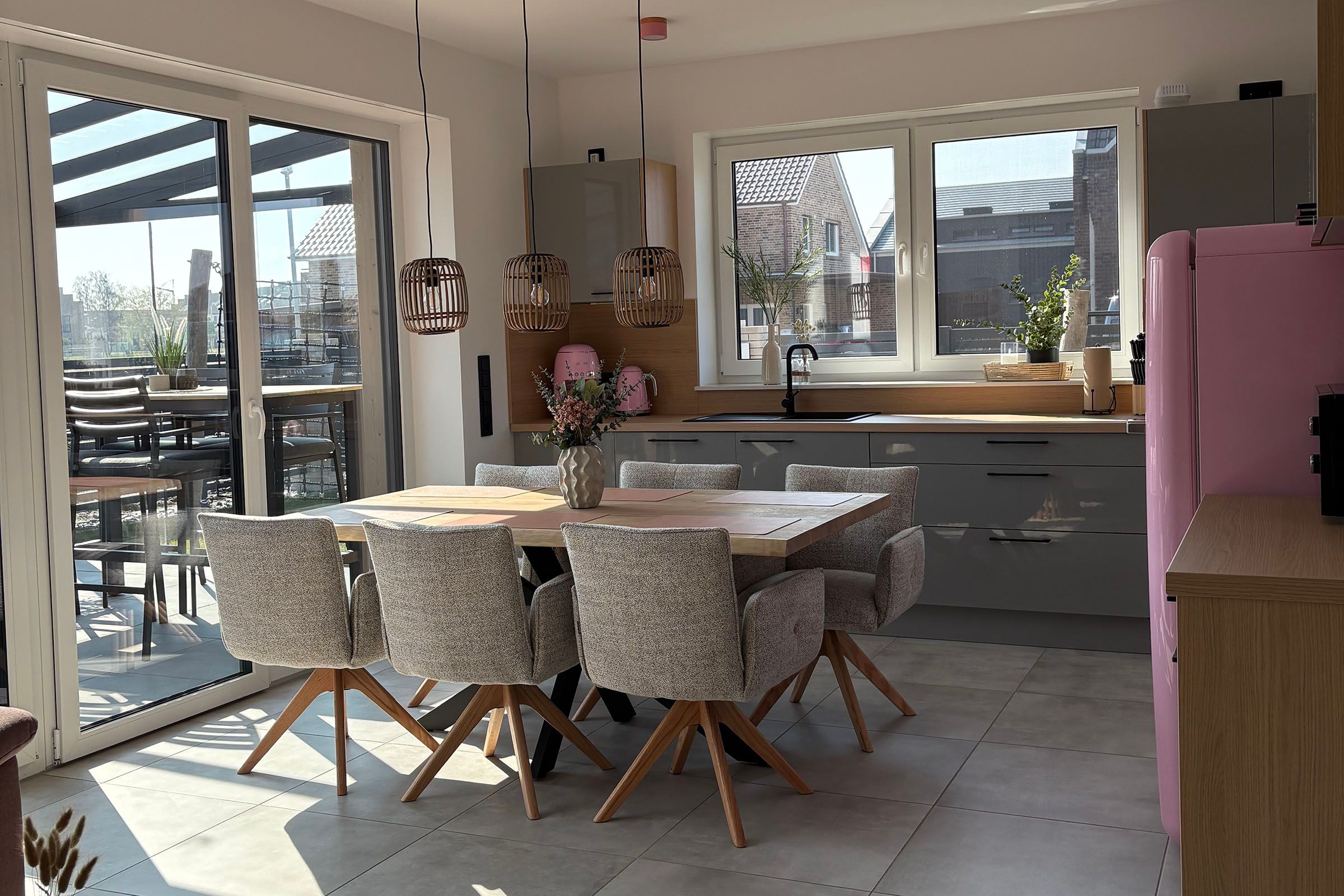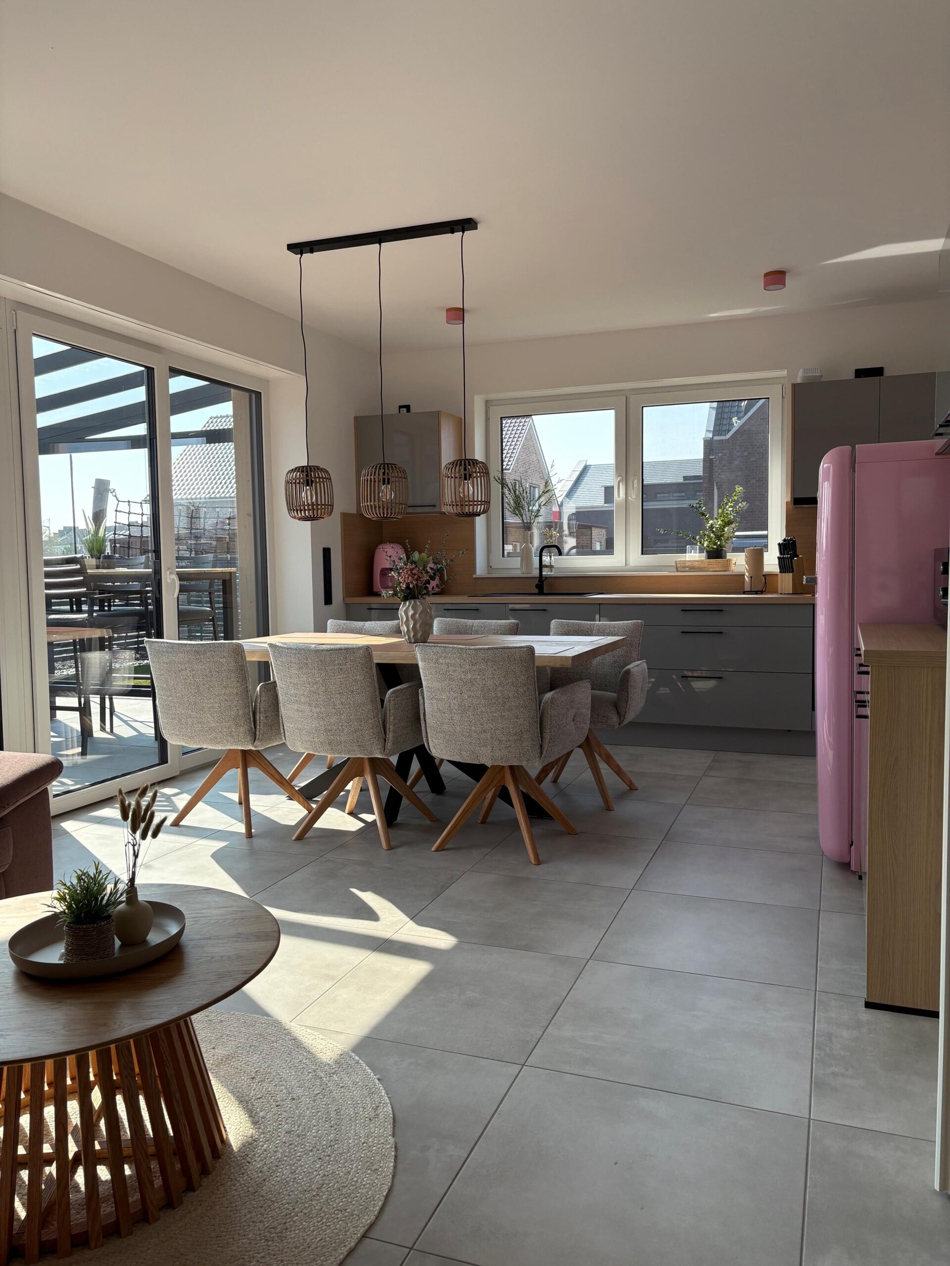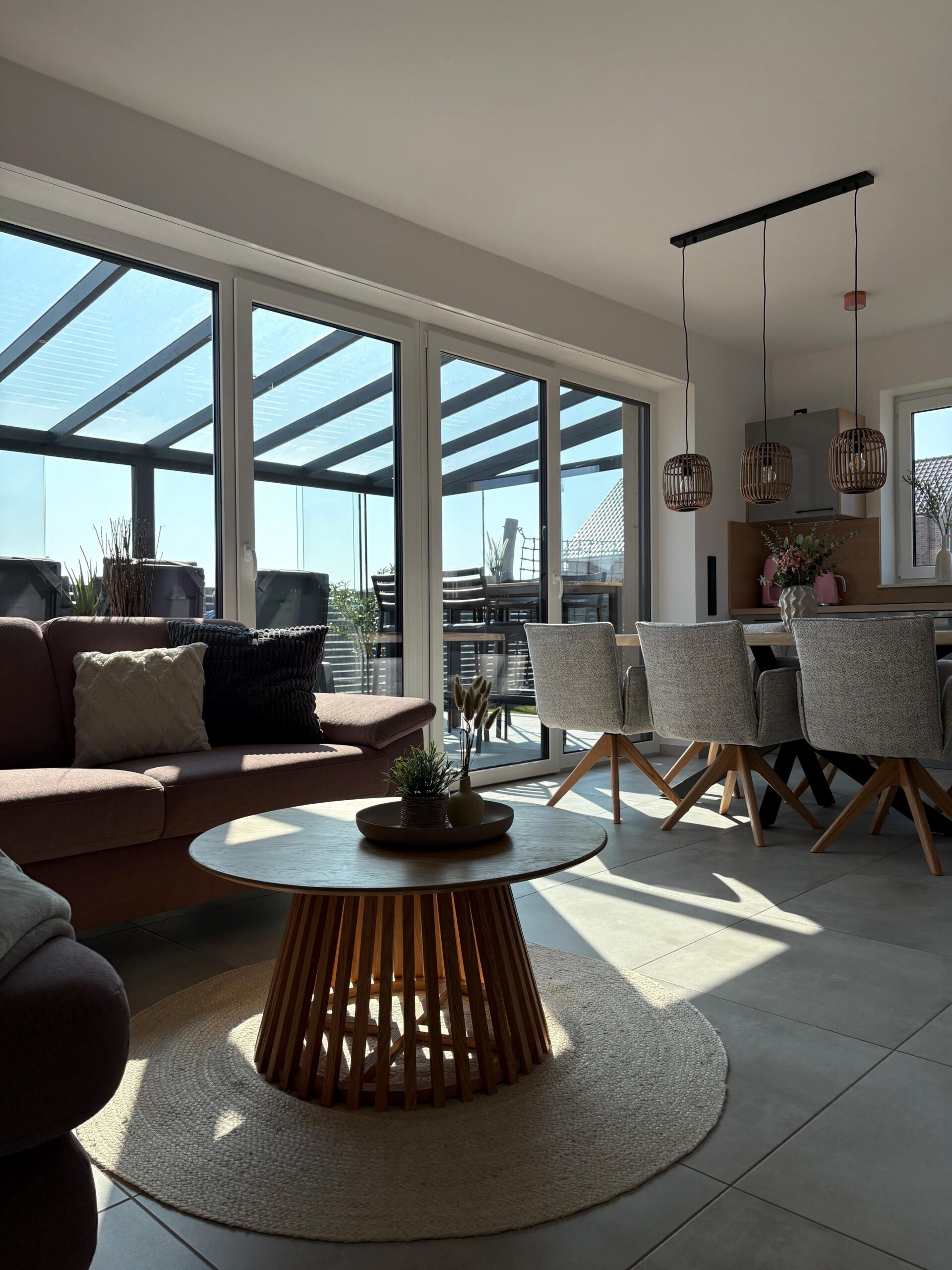 Im Wohnbereich erwartet Sie ein gefliester Boden, eine gemütliche Sofaecke mit Sofa, Sesseln und TV (Satellitenanschluss) sowie WLAN und Radio. Der Essbereich mit Esstisch ist offen in den Wohnraum integriert und wird durch eine zum Wohnzimmer offene Küche ergänzt. Diese ist umfassend ausgestattet mit Ceran-Herd, Backofen, Mikrowelle, Kühlschrank, extra Gefrierschrank, Spülmaschine, Kaffeemaschine, Wasserkocher, Toaster, Mixer sowie Küchenutensilien, Geschirr und Besteck. Eine Erstausstattung ist vorhanden, ebenso Bettwäsche, Handtücher, Badetücher und Geschirrhandtücher.